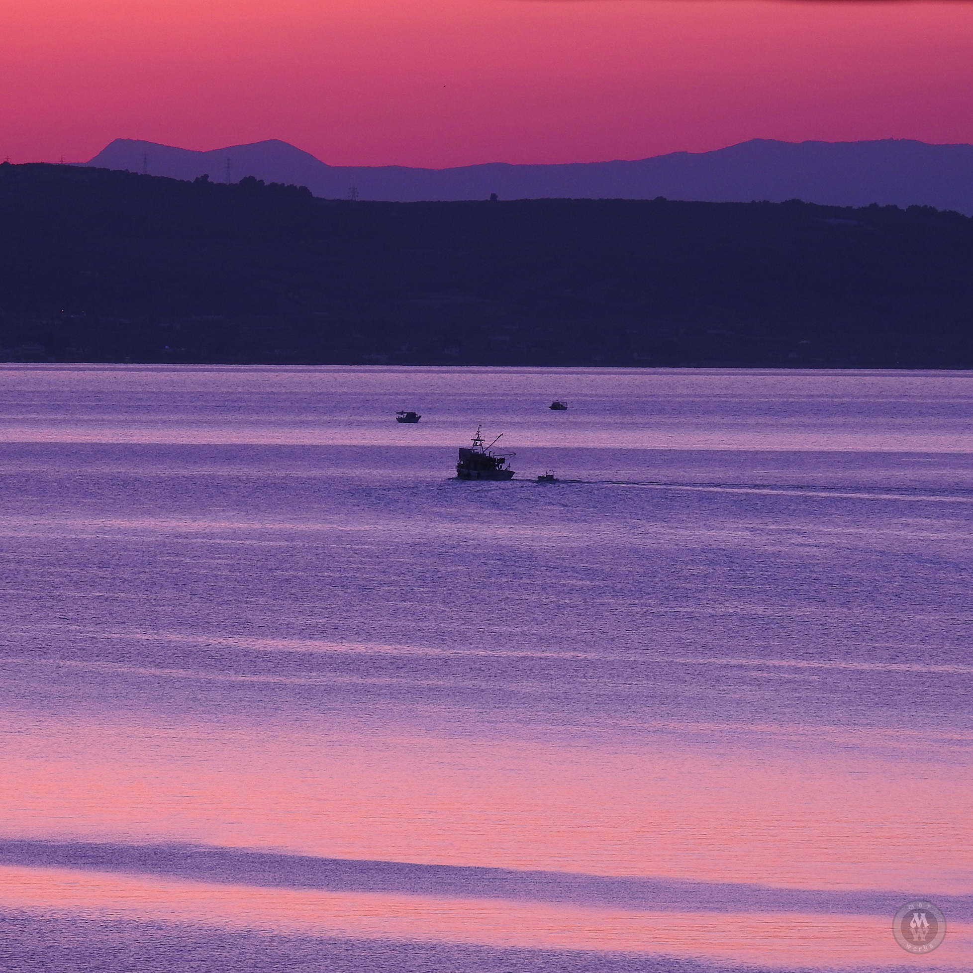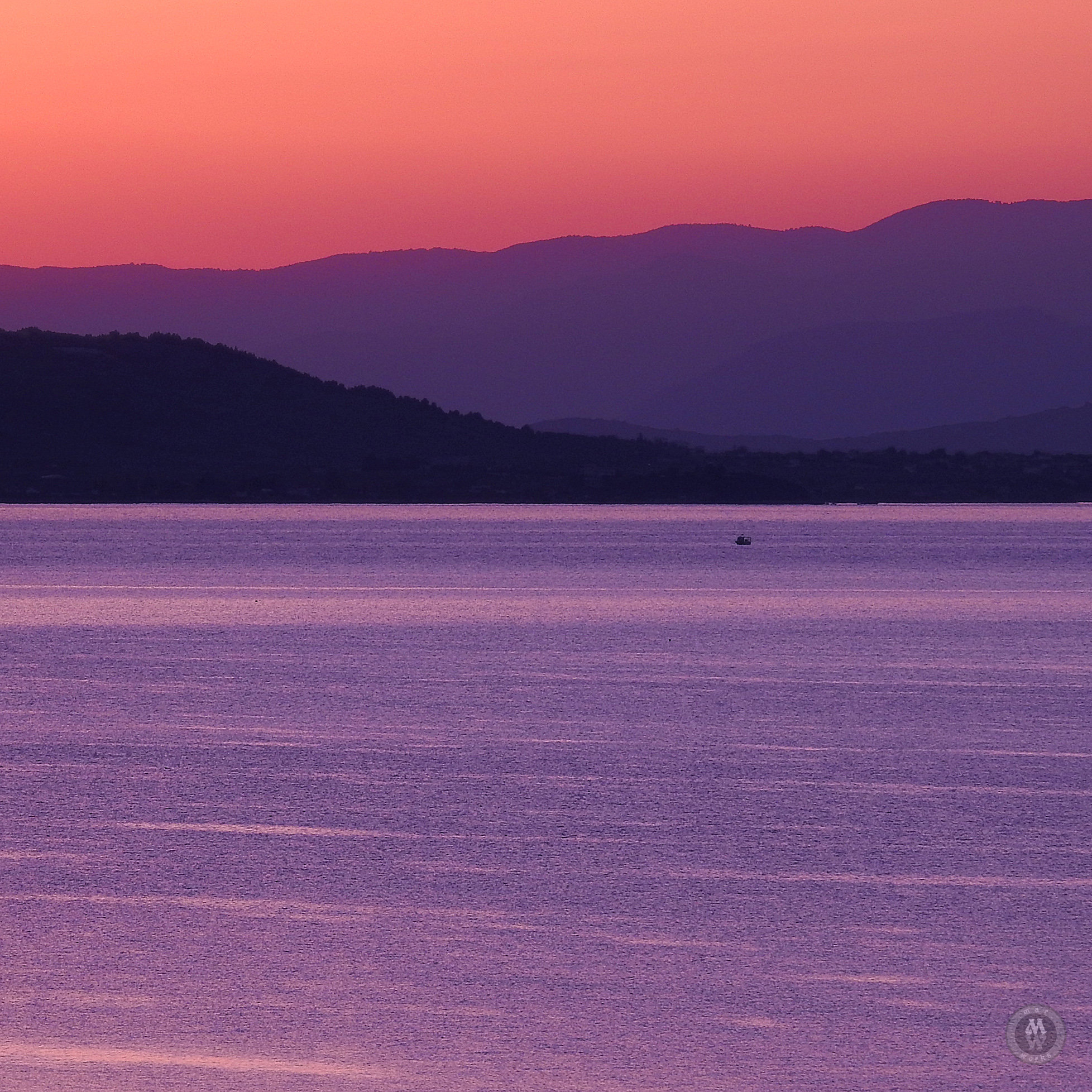 A boat moving towards the sunset