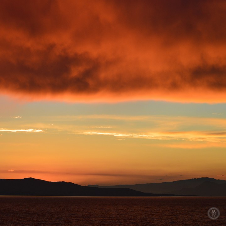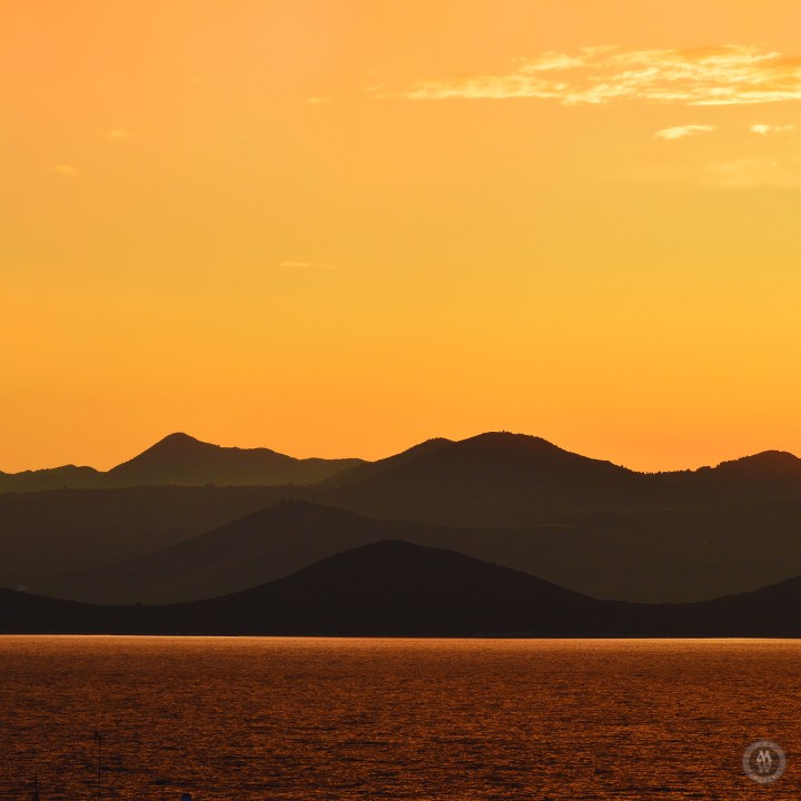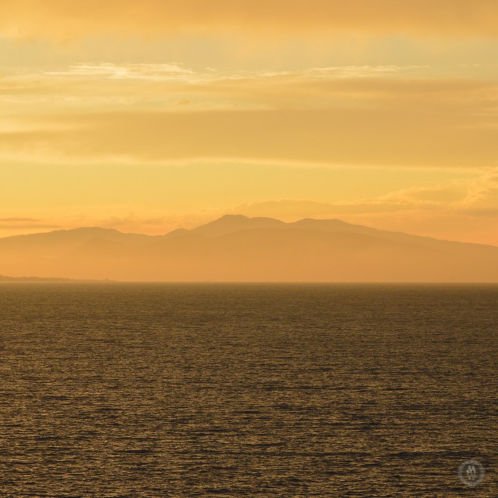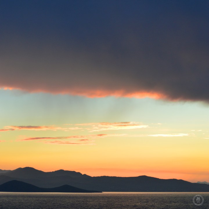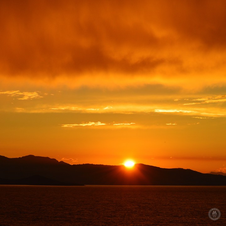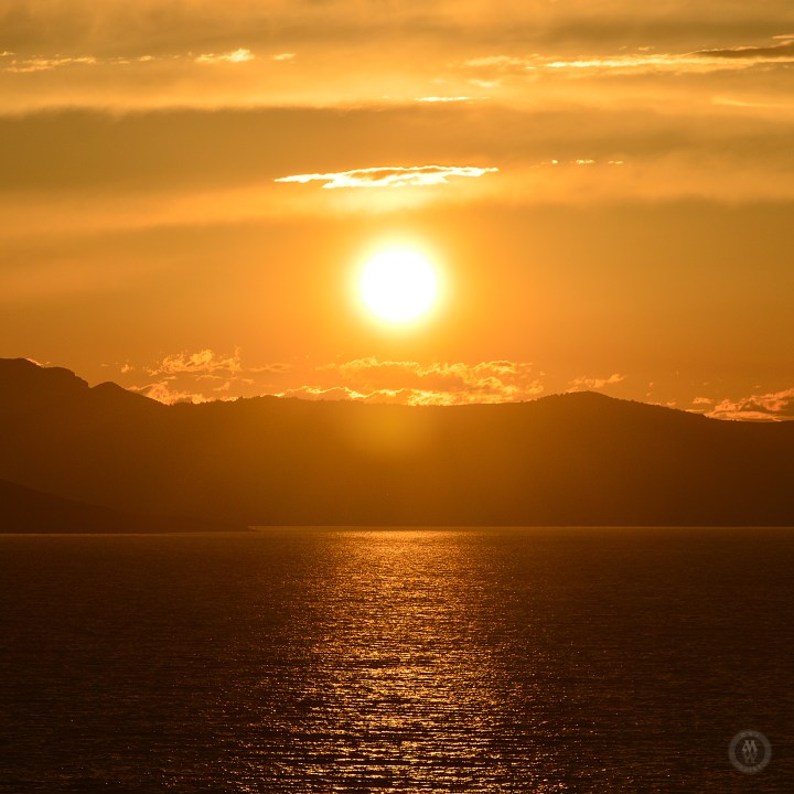 Sunsets over the water is always nice, With the clouds and hills or mountains, even better.