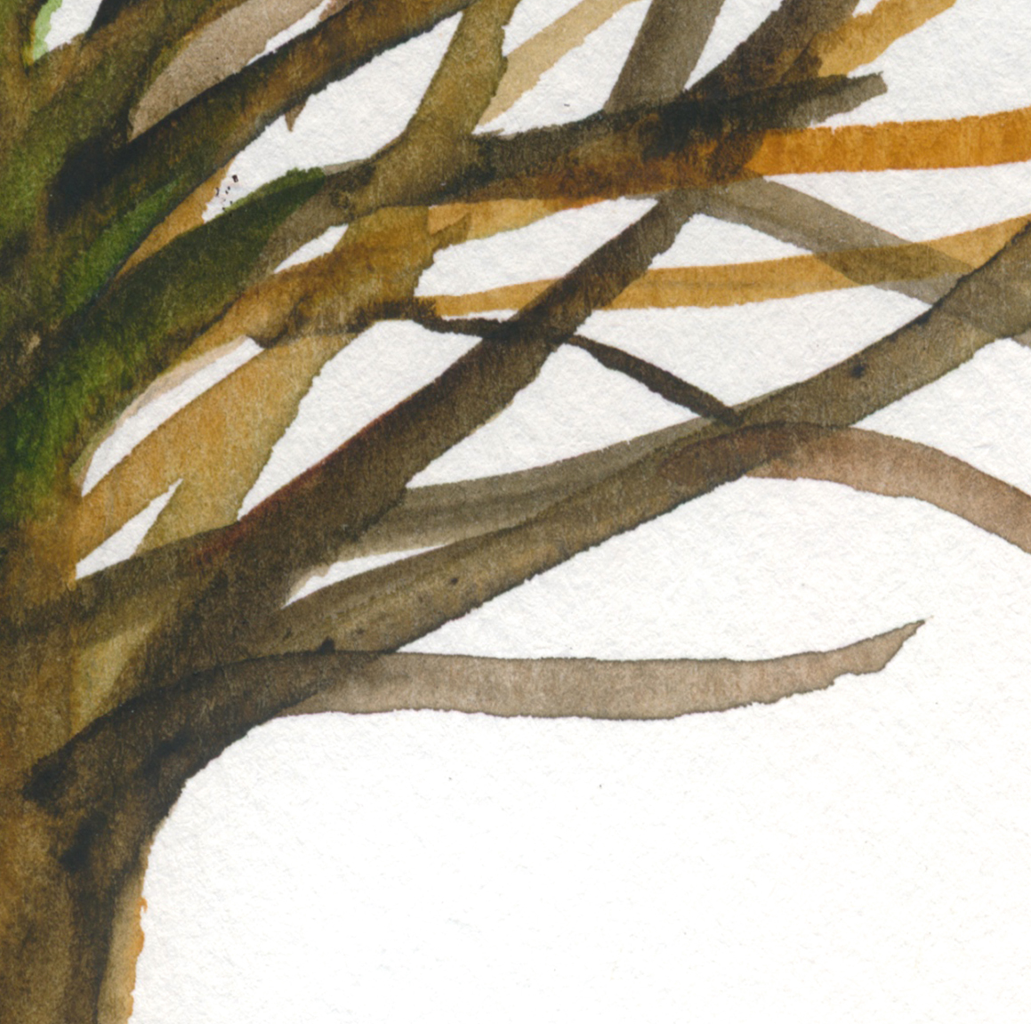 Description: Inspired by trees and the duality of our nature, I painted this tree which is half full green and half barren. The ground underneath nurtures them equally. I see beauty in both. Green, moss & lime green to brown, sepia, burnt umber… coexist in search of harmony
